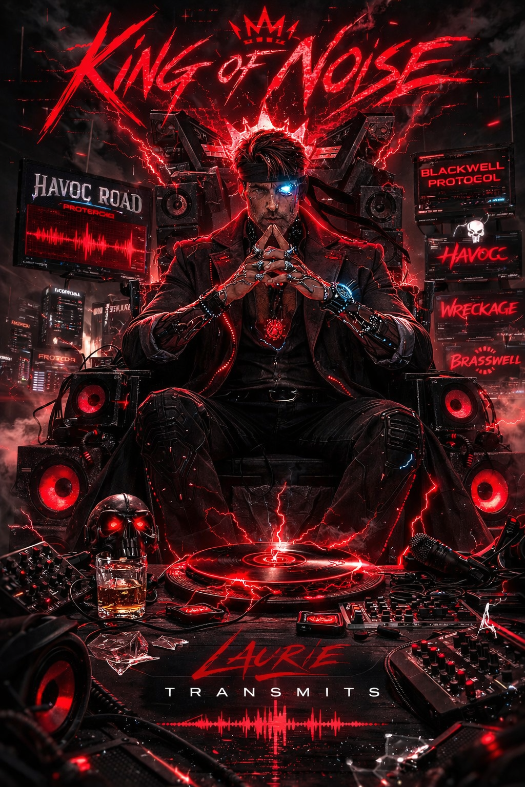 Part human origin, part machine evolution, Laurie operates at the center of the system — building the noise, shaping the chaos, and transmitting it outward. His sound blends heavy rock energy with industrial electronics and cyberpunk atmosphere, designed to hit hard and carry weight.